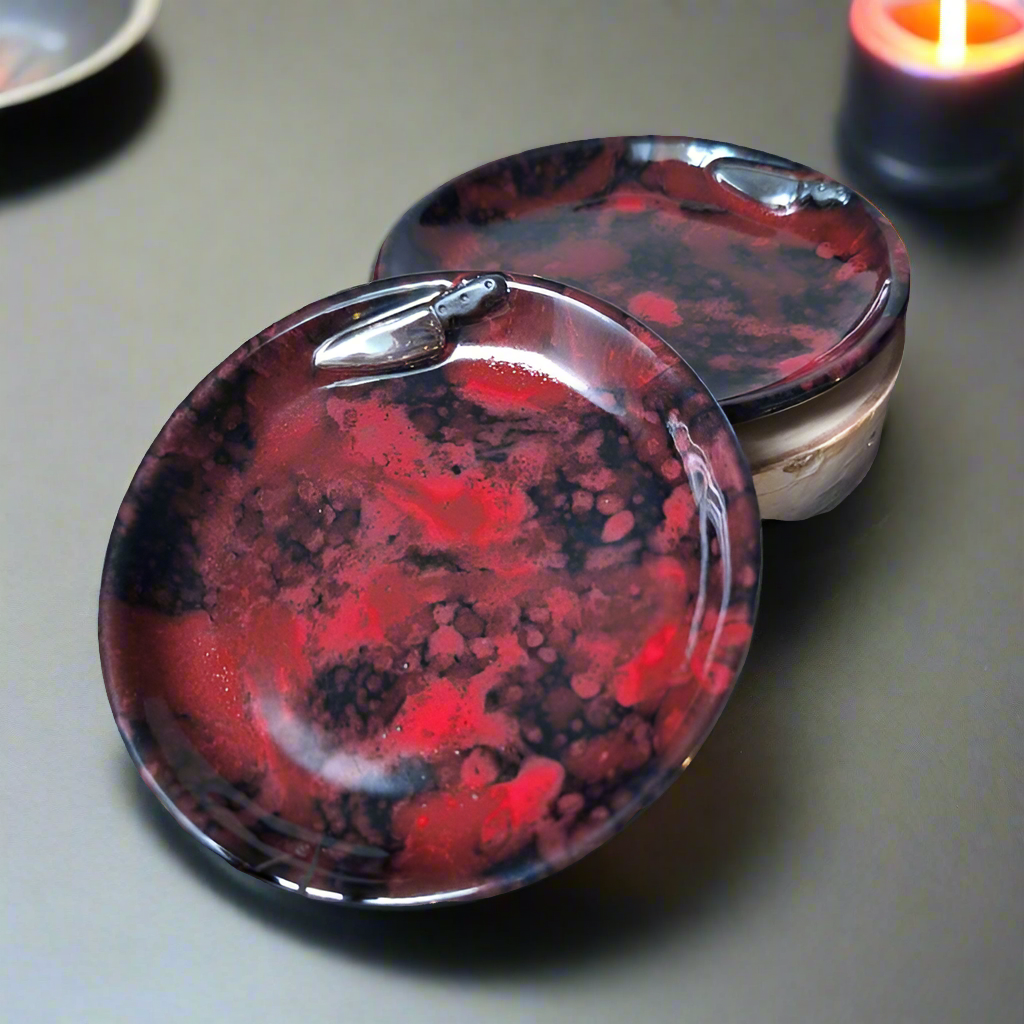 elevate your candle game with our exclusive bloody knife candle plate! each plate is uniquely designed with a blood splatter and a knife, adding a touch of terror to any room. don't miss out on this killer addition to your home decor!