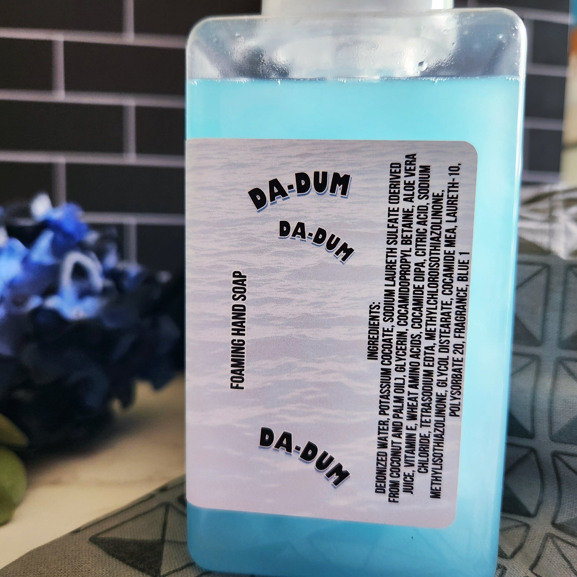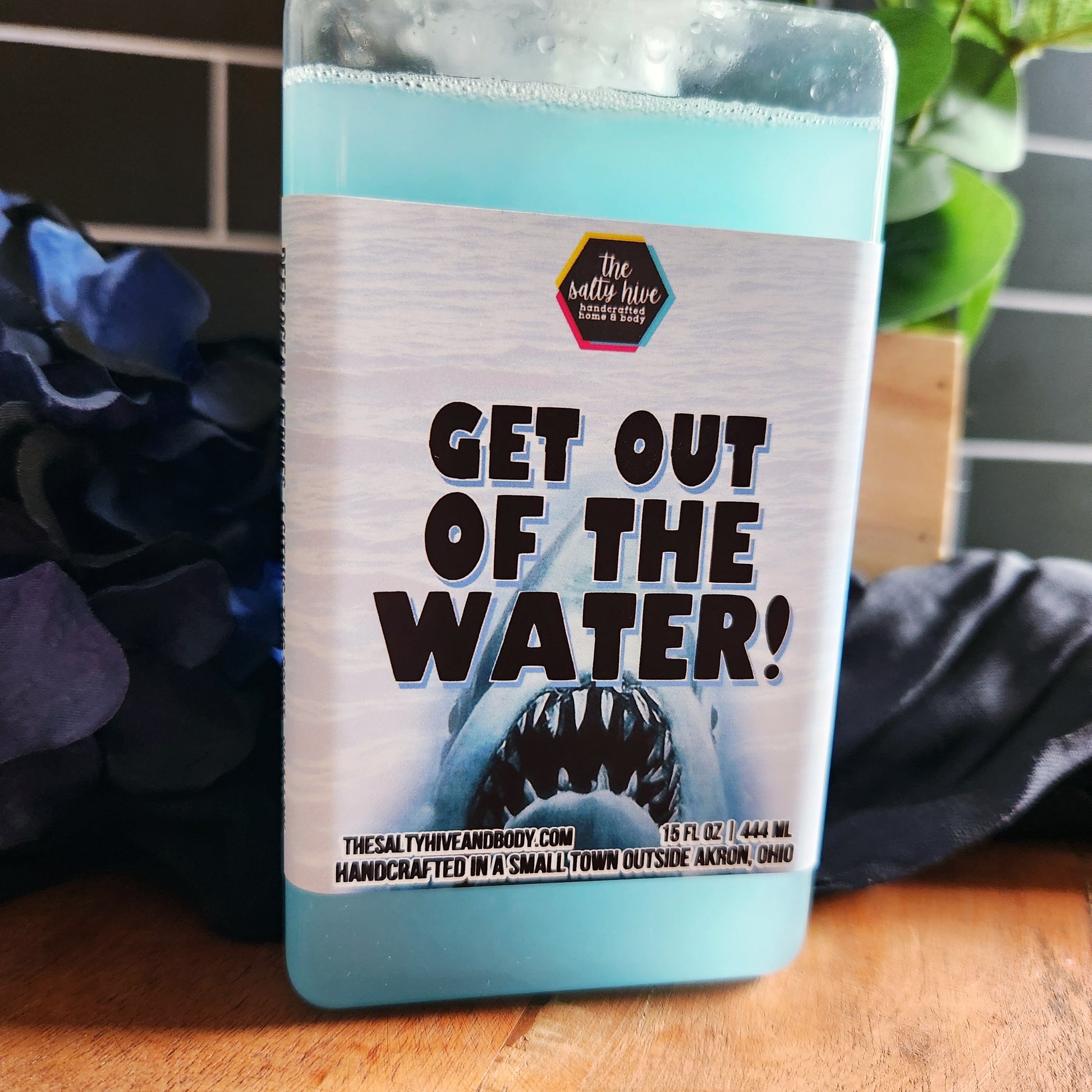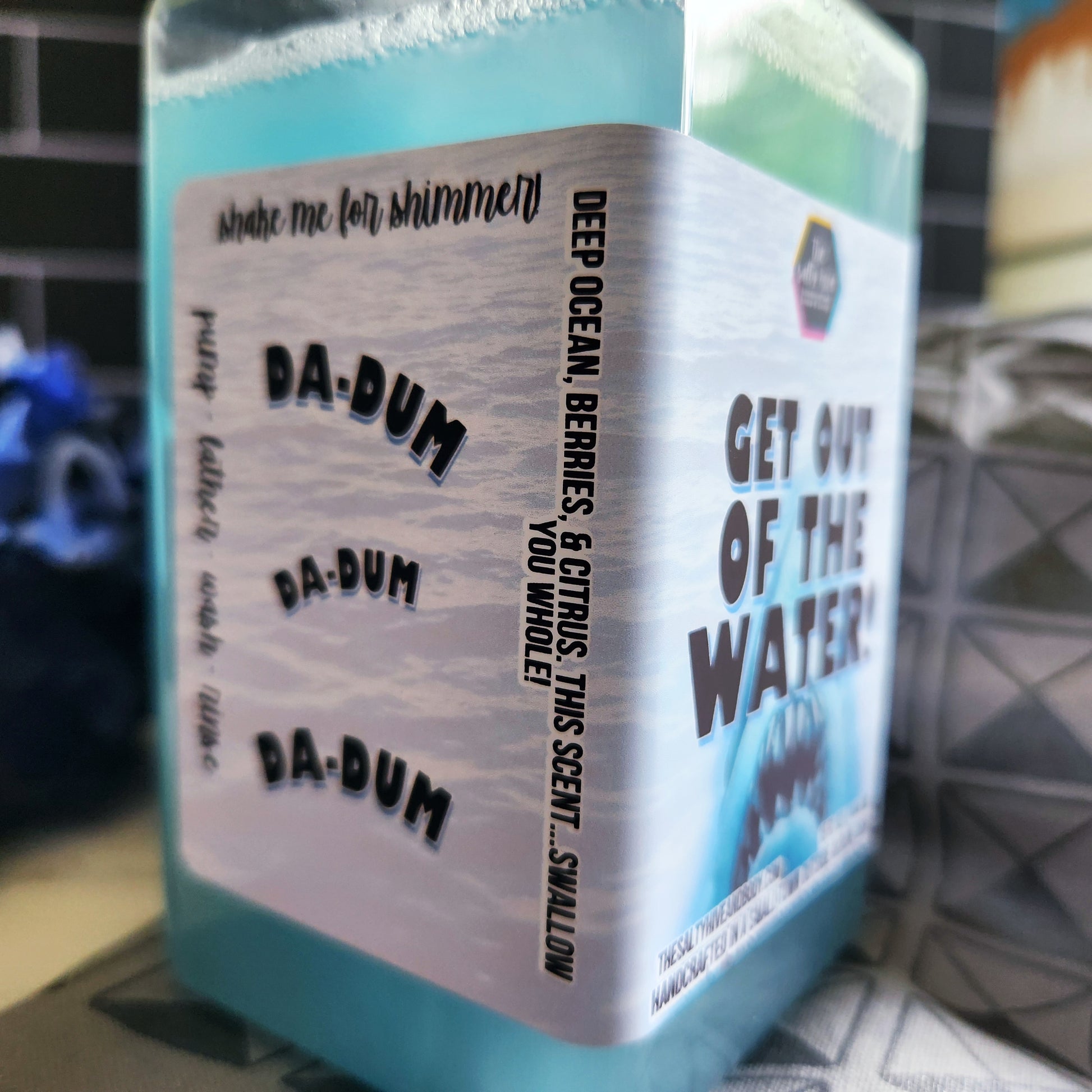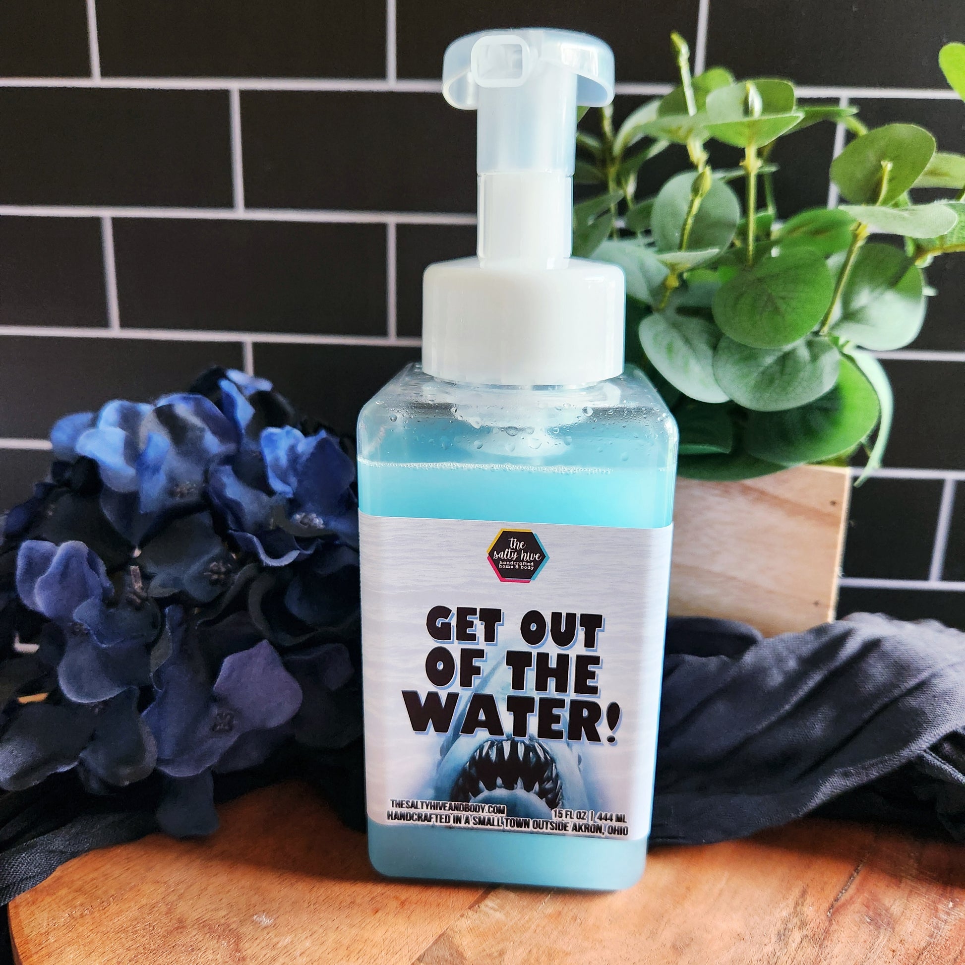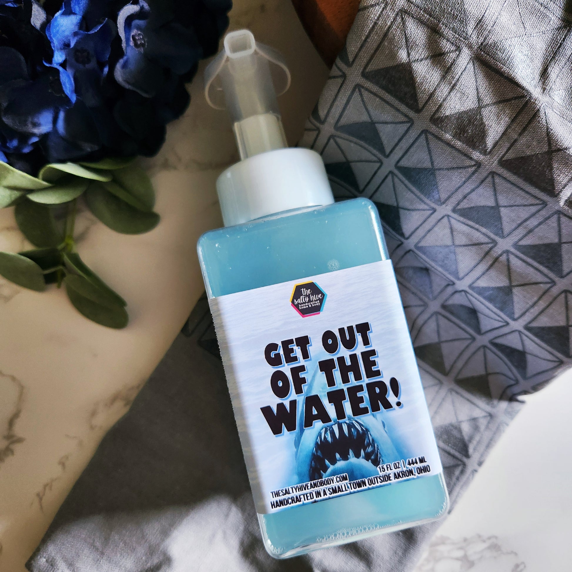 bring the deep blue ocean of jaws into your home with our popular get out of the water hand soap! the signature blend of berries, citrus, & deep ocean scents will make your space feel like a summer beachside retreat. just don't forget to keep one eye on the horizon!🦈gonna need a bigger sink!