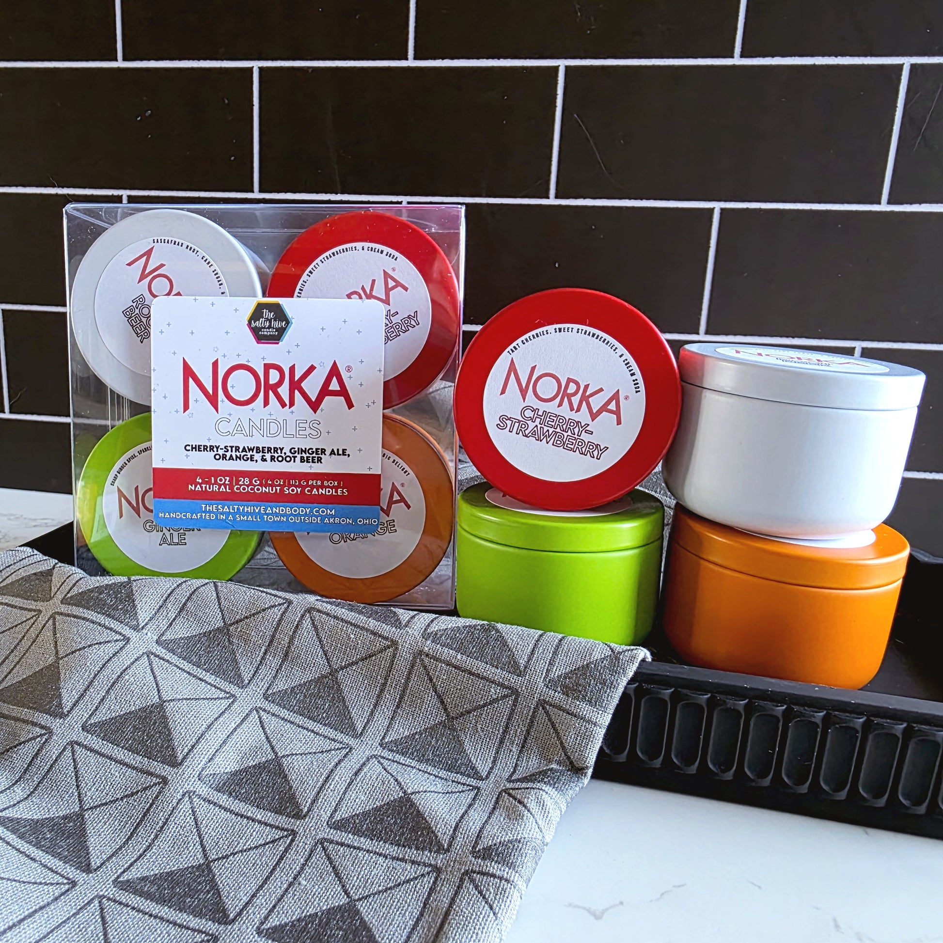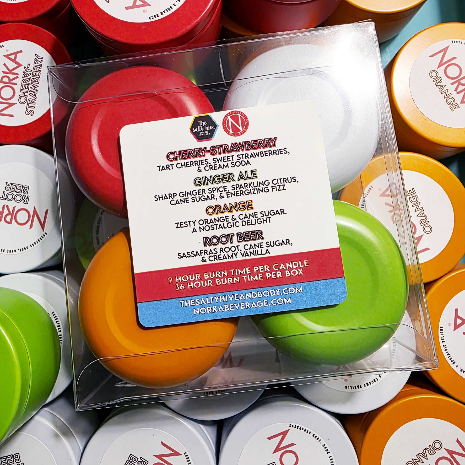experience the delightful collaboration between the salty hive and NORKA with this mini 4 pack of soda inspired candles. each 1 oz candle captures the essence of NORKA's sparkling beverages, infusing your space with refreshing scents that inspire joy and nostalgia.