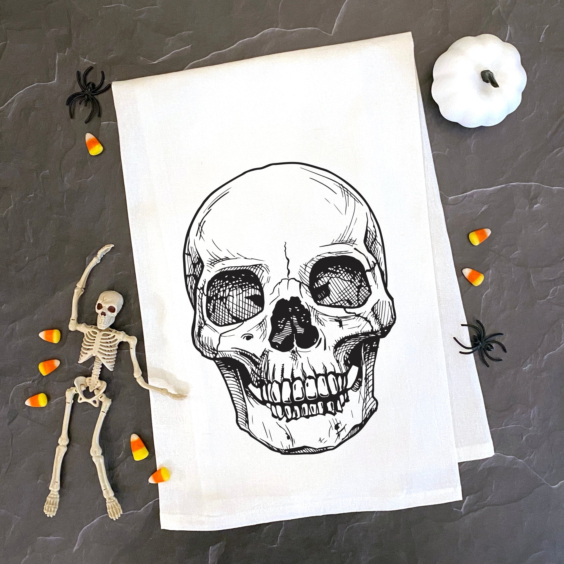 celebrate halloween year-round with this white cotton flour sack towel, printed with our vintage style hand etched design of a human skull in black ink.